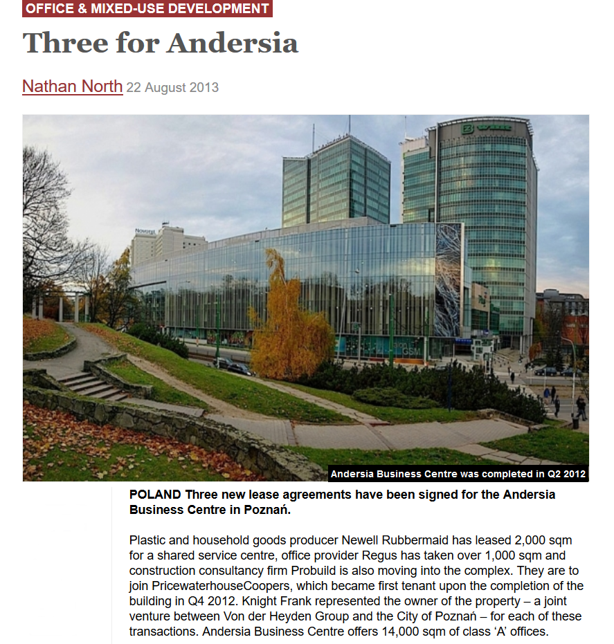 Plastic and household goods producer Newell Rubbermaid has leased 2,000 sqm for a shared service centre, office provider Regus has taken over 1,000 sqm and construction consultancy firm Probuild is also moving into the complex. They are to join PricewaterhouseCoopers, which became first tenant upon the completion of the building in Q4 2012. Knight Frank represented the owner of the property – a joint venture between Von der Heyden Group and the City of Poznań – for each of these transactions. Andersia Business Centre offers 14,000 sqm of class ‘A’ offices.
